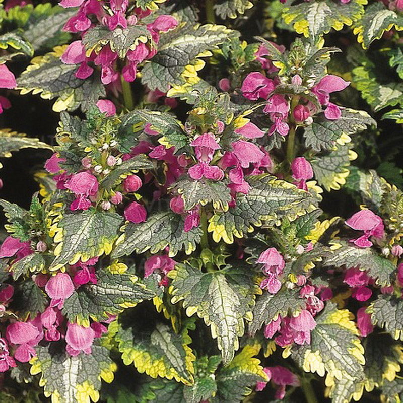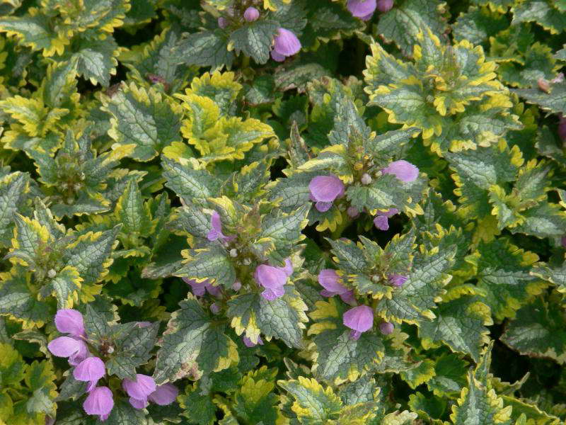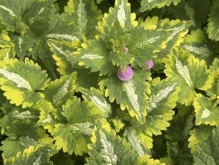 Саженцы яснотки зеленчуковой Голед Анниверсаире (Lamiastrum Golden Anniversary) выращиваются в качестве красивых, но неброских акцентов на клумбах. Это декоративные многолетники, имеющие длинные лежачие побеги и прямостоячие стебли высотой не более 20 сантиметров. Растение расползается по почве, образуя практически сплошной, густой ковер. Резные листья нежного зеленого цвета с желтыми краями. Розоватые мелкие цветки появляются в начале мая, к июлю уже осыпаются. Многолетник декоративен именно из-за зелени, которая хорошо смотрится в любых клумбах и цветниках.
